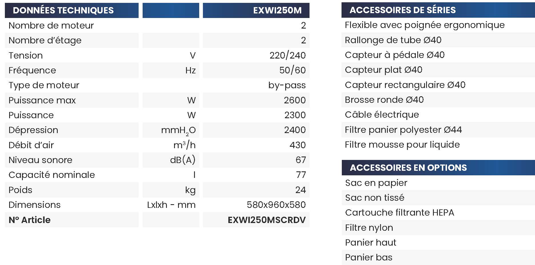 Aspirateur eau & poussières 2300 watts - Cuve Plastique ou inox 77L