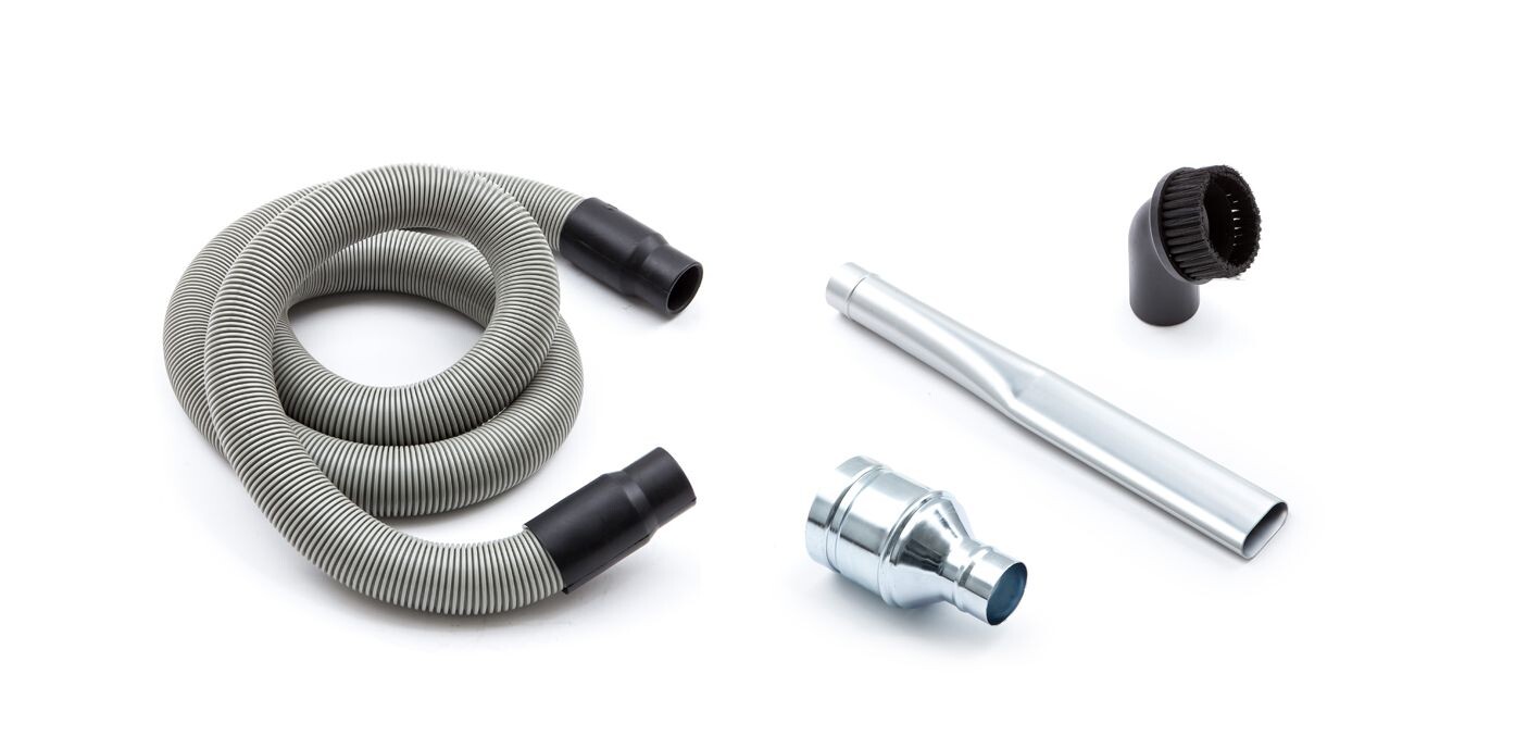 - Un kit d’accessoires Ø 50 mm. est fourni avec l’aspirateur, comprenant : réduction 80 – 50 mm., tuyau flexible Ø 50 mm. (3 mt.), embouchure plate aluminium, pinceau PVC. Autres accessoires et flexibles de différentes longueurs sont disponible sur demande.