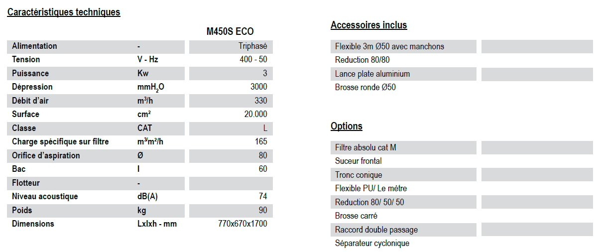 Aspirateur industriel à turbine M450S ECO pour fonctionnement intensif