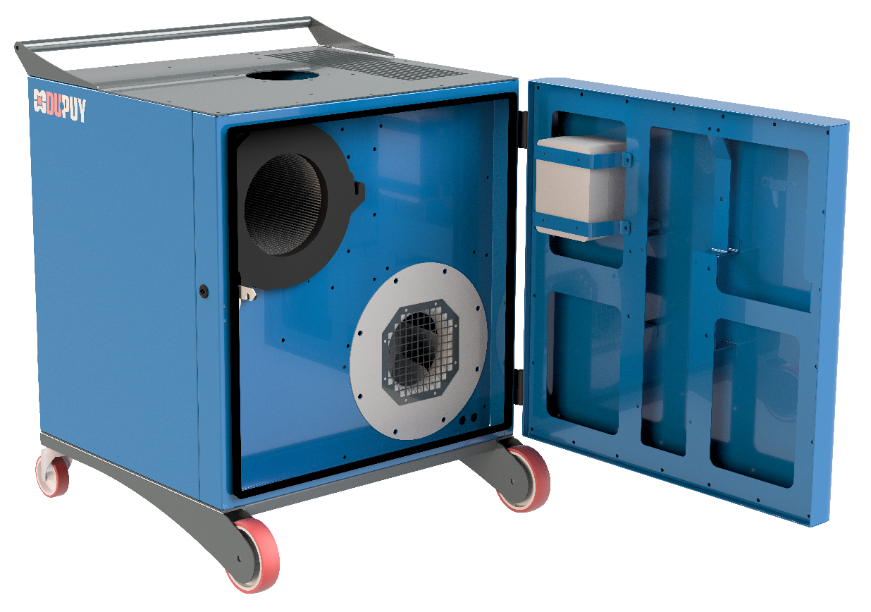 Le dépoussiéreur industriel DEDUST 1 est un aspirateur industriel compact et puissant équipé d'un ventilateur électrique qui garantit un débit d'air élevé. Grâce à cette caractéristique, le dépoussiéreur est adapté à l'extraction localisée des fumées de soudage et des poussières fines de coupe de bois grâce à la possibilité d'installer un bras articulé.