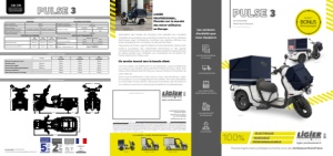 USAGE INTENSIF PERFORMANCES ÉLECTRIQUES SÉCURITÉ • Châssis renforcé adapté à une utilisation intensive • Panneaux de carrosserie interchangeables • Bumper arrière haut de protection carrosserie Innovation originellement brevetée par Ligier Professional, ce système permet une inclinaison du poste de conduite, dans les virages, de +/- 30°, garantissant une parfaite stabilité tant en conduite qu’à l’arrêt. 100% personnalisable, cet utilitaire s’adapte aux besoins des professionnels du transport et de la logistique du dernier kilomètre. Scooter électrique à trois roues, le Pulse 3 bénéficie d’un faible encombrement qui permet d’accéder facilement aux zones urbaines. • Batterie lithium rechargeable sur prise domestique • Jusqu’à 121km d’autonomie * • Récupération de l’énergie au freinage • Stationnement stabilisé sans béquille • Avertisseurs sonores, piéton, bip de recul • Troisième feu de stop Le scooter électrique à trois roues ! Plébiscité pour la livraison du dernier kilomètre ! Compact et agile ! Maniable et personnalisable ! PULSE 3 PULSE 3 A B C D ÉQUIPEMENTS PULSE 3 L2e • L5e Le + : Système pendulaire breveté ! PULSE 3 Innovation originale Ligier Professional Personnalisation sur mesure ! Pare-vent avec protection jambes Pare-vent A B Stock arrière grand volume Contenant avant C D L2e • L5e EN OPTION DE SÉRIE Véhicule Système pendulaire exclusif breveté : stabilité et maniabilité du véhicule • Châssis renforcé adapté à une utilisation intensive et professionnelle • Poste de conduite défini par ergonomes du travail • Selle confort + bi-densité et réglable 3 positions longitudinales • Carrrosserie ABS teintée masse haute tenue UV • Couleur standard : Blanc RAL 1099 • Panneaux de carrosserie démontables et interchangeables • Couleurs spécifiques • Toutes adaptations spécifiques étudiables selon la faisabilité • Sécurité Freinage assuré par freins hydrauliques indépendants AV/AR avec étriers flottants à disques ventilés (L2e et L5e) / Freinage combiné et pédale (L5e) - Disque AV : Ø220mm / Disque AR : Ø180mm (L2e et L5e) • Frein de parking avec blocage simultané du mouvement pendulaire (immobilisation véhicule chargé sur pente 20%) • Stationnement stabilisé sans béquille • Rétroviseur droit et gauche • Avertisseur sonore, avertisseur piéton, bip de recul, avertisseur sonore de non présence de conducteur sur la selle • Bumper arrière haut de protection carrosserie et marchandises • Bumpers latéraux gauche et droit protection des pieds du pilote • Troisième feu de stop • Pare-vent • Pare-vent avec protection de jambes • Chargements Zone de chargement avant sur structure tubulaire acier pour recevoir un stock • Stock arrière rigide (320 litres) • Coffre sous selle verrouillable (10 litres) • Stock arrière grand volume (550 litres) • Contenant avant (30 litres) • Stocks avant et arrière personnalisables à la demande du client • Performances électriques Charge véhicule sur prise domestique et adaptable en fonction des pays • Accélération fluide et progressive calibrée pour la livraison du dernier kilomètre + réactivité • Récupération de l’énergie au freinage • Sécurité câble de charge • Confort Marche arrière motorisée • Combiné compteur avec technologie optical Bonding • Large zone centrale repose pied renforcée en aluminium larmé anti dérapant • Double prise USB 5V 1A sous la selle pour GPS ou smartphone • Câble de charge 5m embarqué • Pneu arrière à bande de roulement plate permettant d’améliorer la stabilité, l’adhérence et le confort • +30° -30° Compteur avec technologie optical Bonding 3 freins hydrauliques à disque ventilé Coffre sous selle avec double prise USB 5V Frein parking avec blocage pendulaire JUSQU’À 80 Kg (2) ligier-professional.fr 550 Litres 30 Litres (2) En configuration L5e avec conducteur + option stock arrière grand volume + option sacoche avant(en option) JUSQU’À 550L Litres * Valeur théorique selon cycleWMTC et selon homologation.