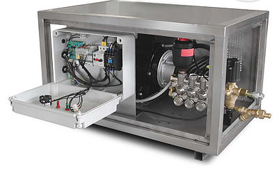 Châssis 100 % inox, pompe professionnelle à 3 pistons céramique et moteur 1.450 tr/min avec accouplement élastique : un ensemble robuste et durable.